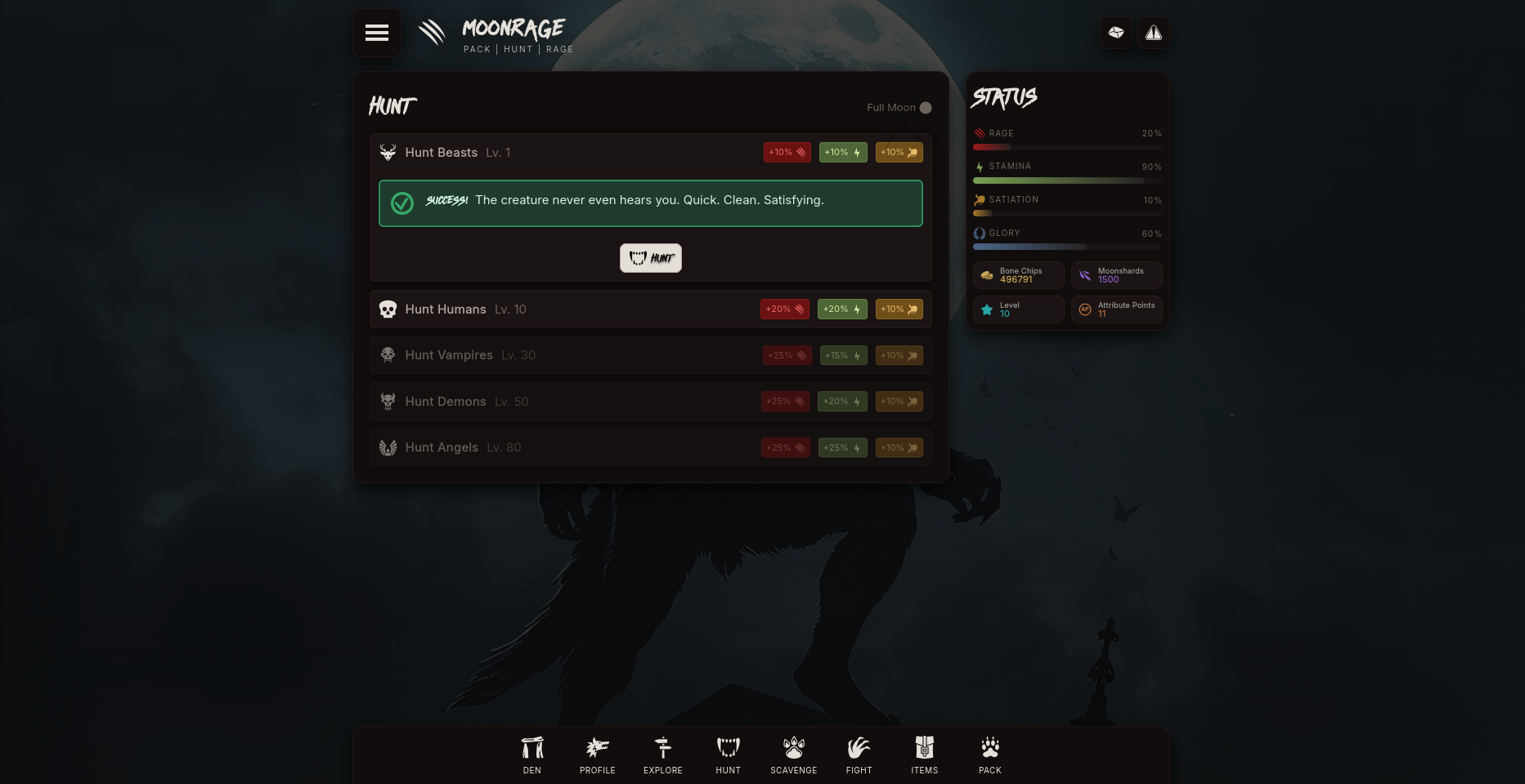 Moonrage is a dark, fast-paced online werewolf RPG where you roam the night, hunt to survive, manage your Rage, and compete with other wolves for dominance. Every action costs Stamina and Rage. Every hunt fuels your strength. Every night brings new dangers.
